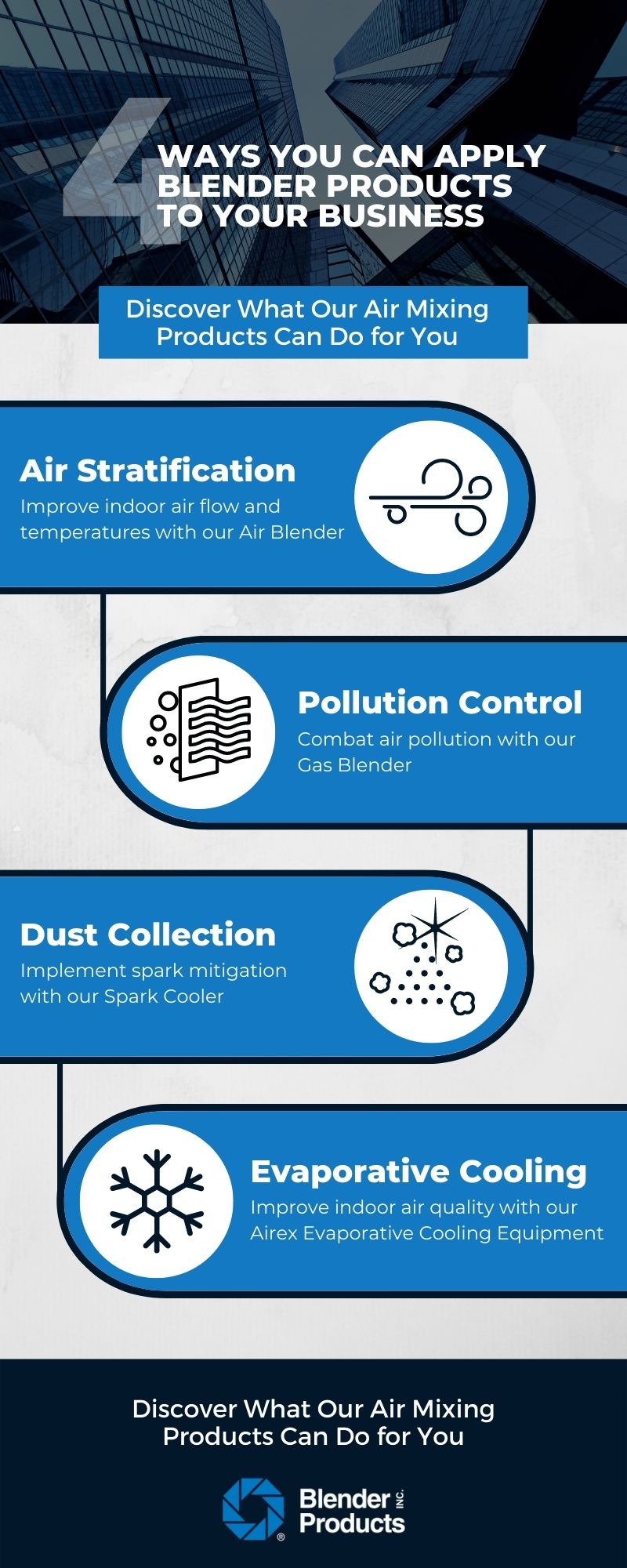At Blender Products, we’re all about developing technology that reduces our environmental impact while also improving the health and comfort of others. That’s why our Denver-based company is proud to offer an extensive range of air mixing products. Our products speak for themselves and have been applied to thousands of processes globally. Keep reading to learn four practical ways to apply Blender Products solutions to your business, then contact us to partner with our company.