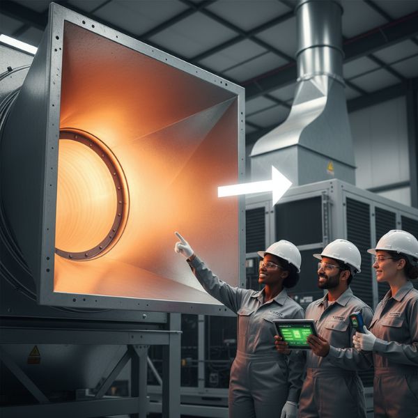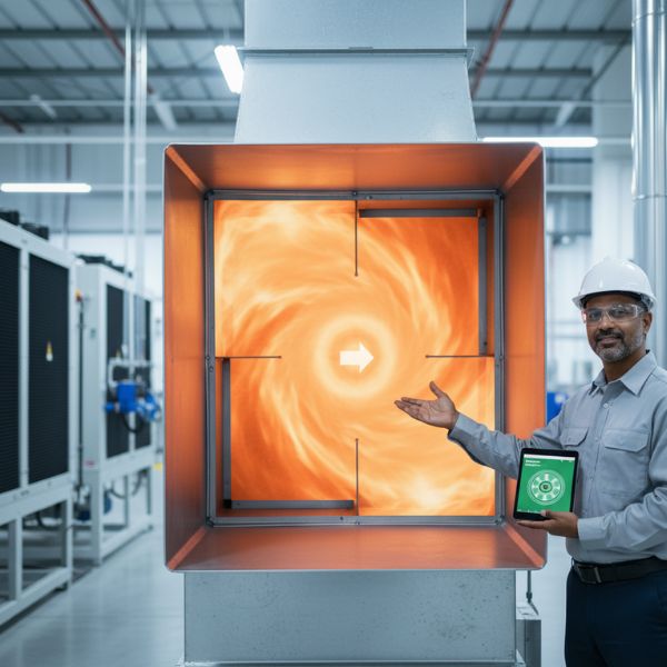 A channel blender is an engineered static mixer installed in the duct. It’s not just a set of baffles; our patented design creates powerful, counter-rotating vortices. It aggressively “channels” and churns the layered air, forcing the 0°F and 70°F streams to blend completely. The result is a uniform air stream—for example, 35°F—across the entire face of the duct, all in a very short distance.
