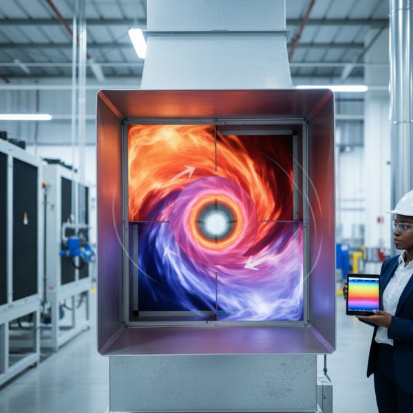 A channel blender is an engineered static mixer installed in the duct. It’s not just a set of baffles; our patented design creates powerful, counter-rotating vortices. It aggressively “channels” and churns the layered air, forcing the 0°F and 70°F streams to blend completely. The result is a uniform air stream—for example, 35°F—across the entire face of the duct, all in a very short distance.